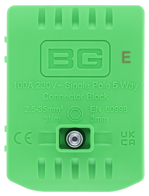 BGBG CB100E 100A 5 Way Connector Block - Earth - Green The BG CB100E-01 100A Earth Connector Block is a robust accessory designed for CP connector sy...