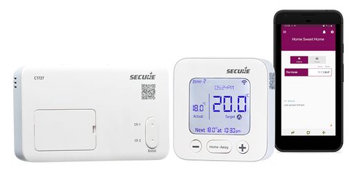 The C1727 can easily control a single or double heating zone, or heating and stored hot water system. You can even control the schedule of an existing wired thermostat or add extra sensors to a spare zone to give further control. There is no hub or gateway to configure and power for remote access; simply plug the Wi-Fi card into the front slot, provide the password via the app and you will be connected.